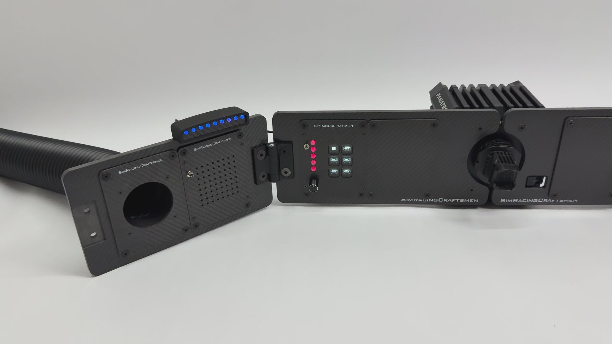 Every component is constructed from full carbon fiber and is fully compatible with SimHub. The layout can be reconfigured, expanded, or upgraded at any time by swapping modules or adding additional brackets.