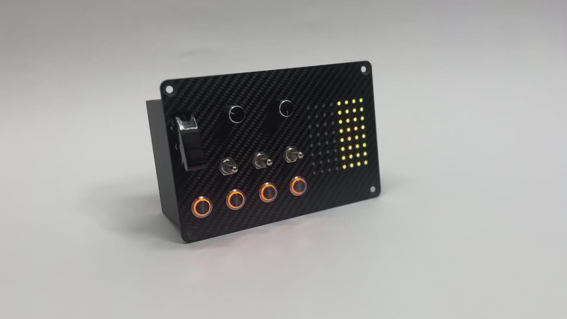 Upgrade your racing setup with the SRC-200 ProFlag Control Button Box. An advanced, full-featured module built for sim racers who need both professional-grade control and clear visual feedback. Featuring a large 8x8 RGB LED matrix and a complete set of race-ready inputs, this 200mm button box delivers clarity, precision, and versatility inside a full carbon fiber enclosure. Whether you need flag indicators, warnings, or extra in-race controls, the ProFlag module provides dependable performance in a clean, motorsport-inspired package.